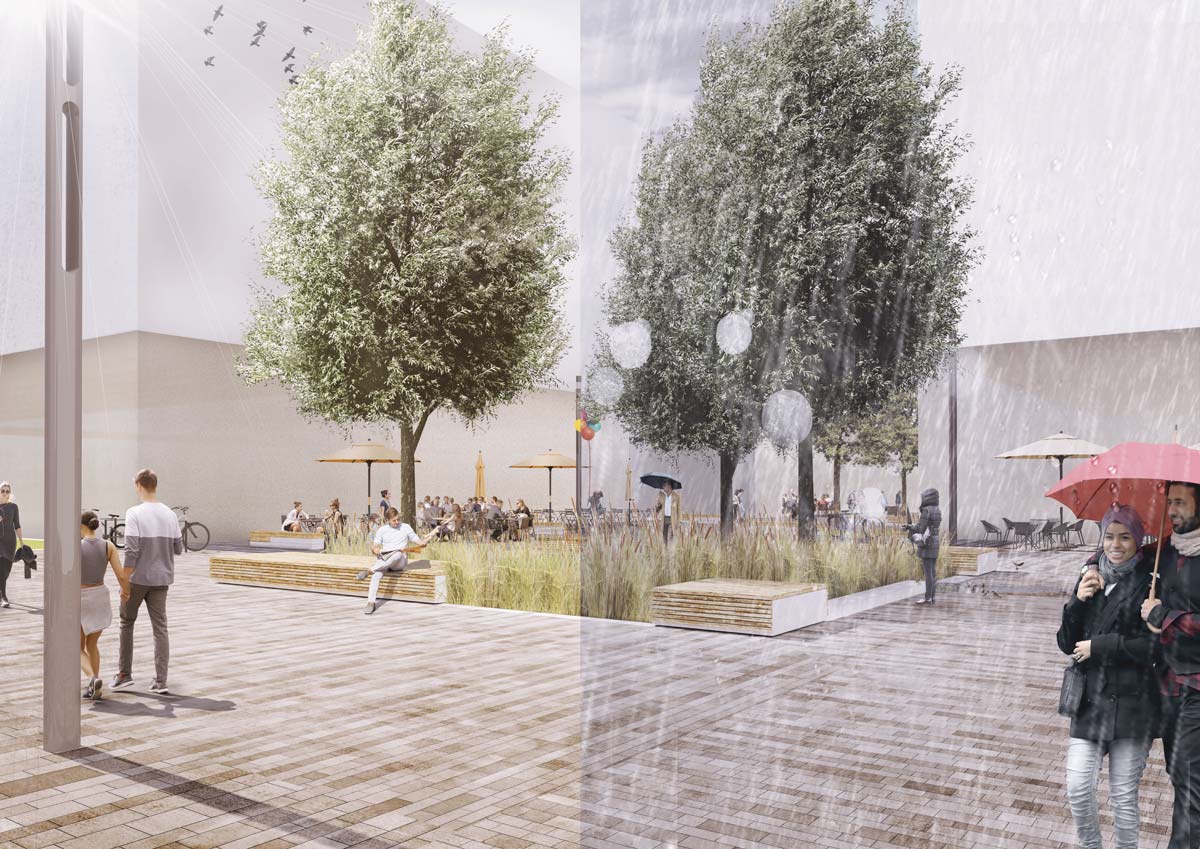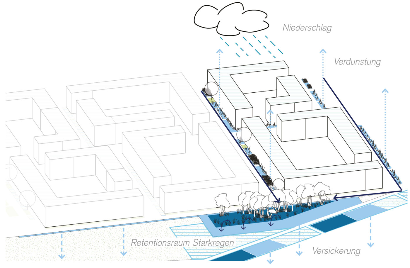 Eine Schwammstadt hält Regenwasser in der Siedlung zurück. Grüne Fassaden und Dächer sowie Straßen- und Freiraumgestaltung begünstigen das Mikroklima und sind Bestandteil der Planung des Quartiers als Schwammstadt. Integrierte Verdunstungs- und Versickerungsflächen nehmen die Niederschläge wie ein Schwamm auf und geben sie größtenteils durch Verdunstung an die Umwelt wieder zurück. Zudem wird durch Versickerung das Grundwasser angereichert. Ressourcenschonend verbleibt das Regenwasser im natürlichen Kreislauf. Die feuchten Grünflächen tragen zur Kühlung des Stadtgebiets während der Hitzeperioden bei, und bei Starkregen regulieren sie die Entwässerung.